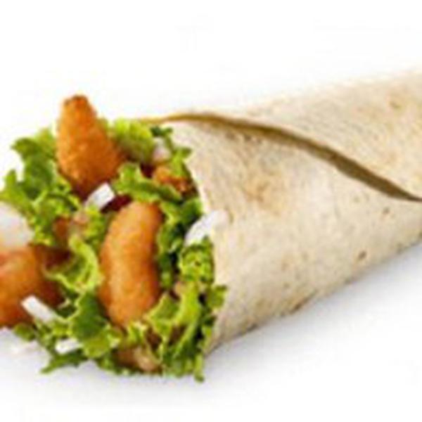 Состав: Нежные креветки в хрустящей панировке, свежий салат Айсберг и лук в пшеничной лепешке, заправленной специальным соусом