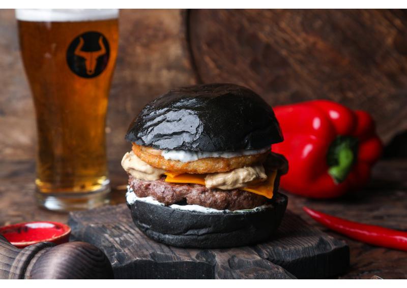 Состав: Котлета говяжья, соус устричный, драник картофельный, соус из белых грибов, сыр чеддер, соус айоли укропный.