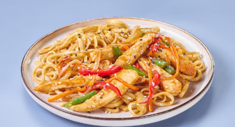 Состав: Курица, лапша удон (лапша удон, вода, подсолнечное масло), терияки соус, кунжут, подсолнечное масло, овощи (лук репчатый, мокровь, стручковая фасоль, пекинская капуста, болгарский перец), микс имбирь-чеснок (подсолнечное масло, чеснок, имбирь, кунжутное масло)
