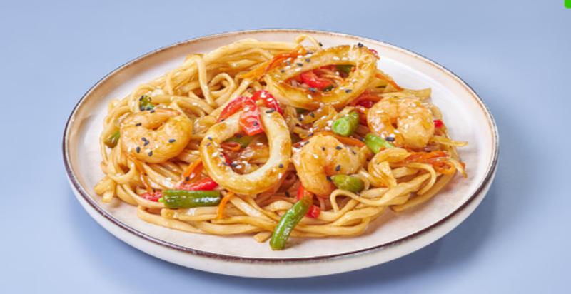 Состав: Креветка, кальмар, лапша удон (лапша удон, вода, подсолнечное масло), соус терияки, кунжут, масло подсолнечное, овощи (лук репчатый, мокровь, стручковая фасоль, пекинская капуста, болгарский перец), микс имбирь-чеснок (подсолнечное масло, чеснок, имбирь, кунжутное масло)