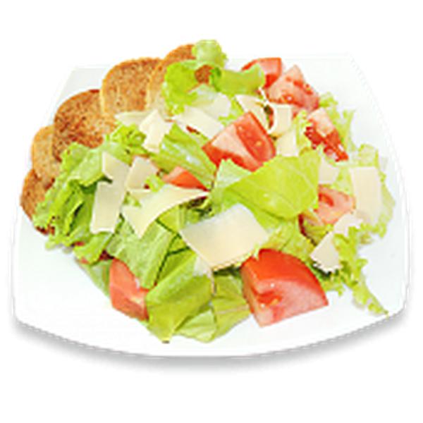 Состав: Сыр пармезан, листья салата, помидор, багет, заправка, специи.