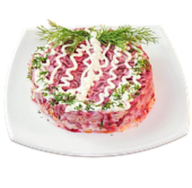 Состав: Сельдь, морковь, свекла, лук, картофель, майонез.