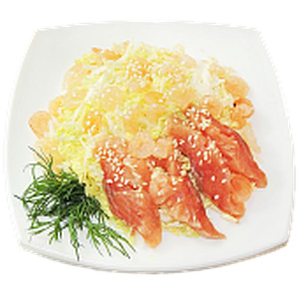 Состав: Семга, креветки, пекинская капуста, заправка на основе растительного масла с кунжутом.