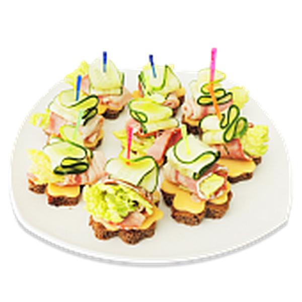 Состав: Хлеб ржаной, сыр, грудинка, сливочный сыр, лист салата, огурец свежий. Набор из 10 шт. по 30 гр.