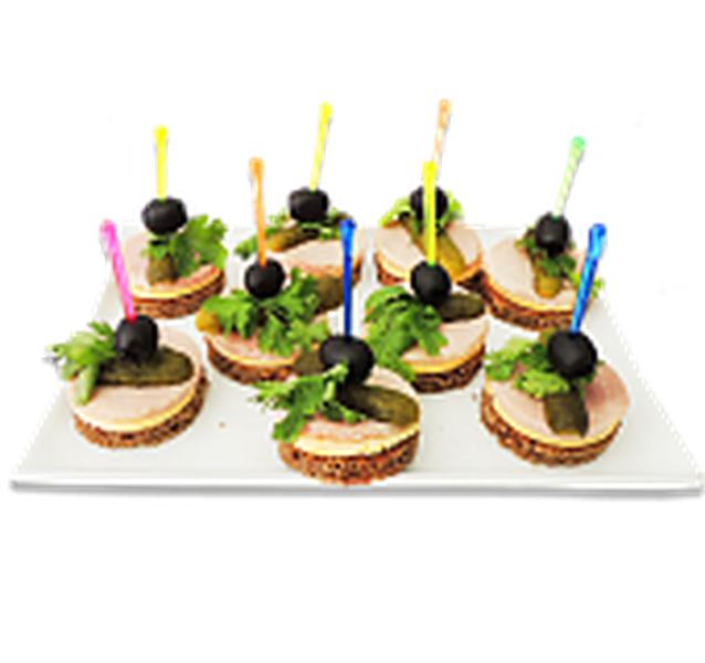 Состав: Хлеб ржаной, сыр, карбонад, корнишон, петрушка, маслина. Набор из 10 шт. по 30 гр.