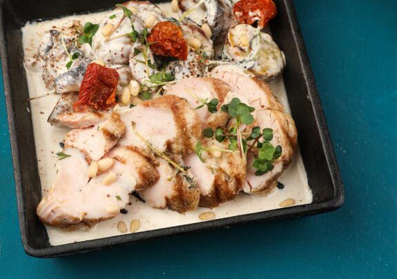 Состав: С беби картофелем, шампиньонами, вялеными томатами, кедровыми орехами, шалфеем и тимьяном