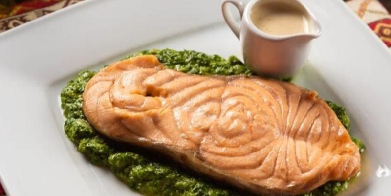 Состав: Нежный стейк семги обжариваем на огне по всем традициям в фирменном маринаде, подаем на шпинатной подложке с икорным соусом.