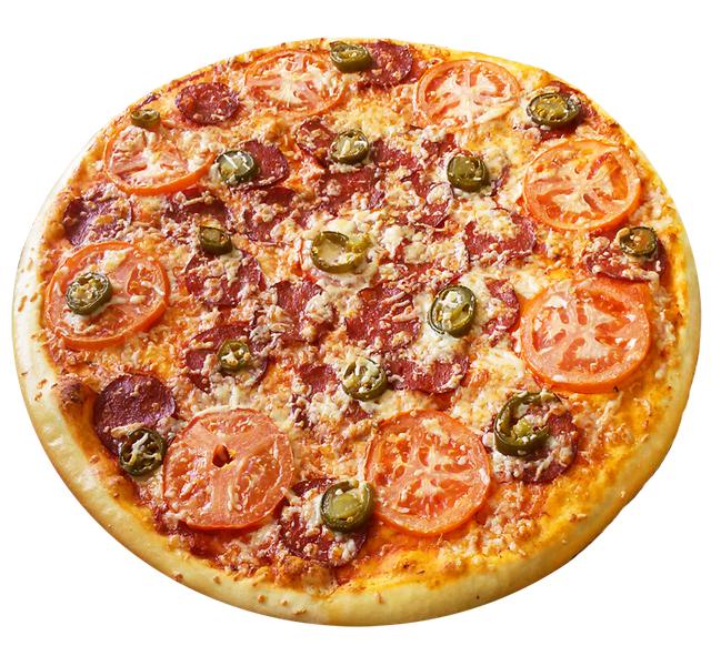 Состав: Острая пицца - острая пепперони, помидор, перчик халапеньо, соус табаско, сыр моцарелла, красный лук, томатный соус, аджика.