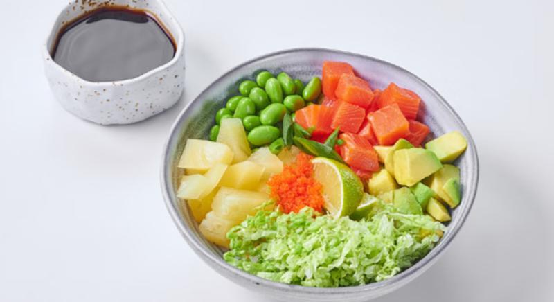 Состав: Лосось, бобы эдамаме, авокадо, пекинская капуста, ананас, оранжевая икра масаго, зеленый лук, ореховый соус, поке соус, лайм, рис
