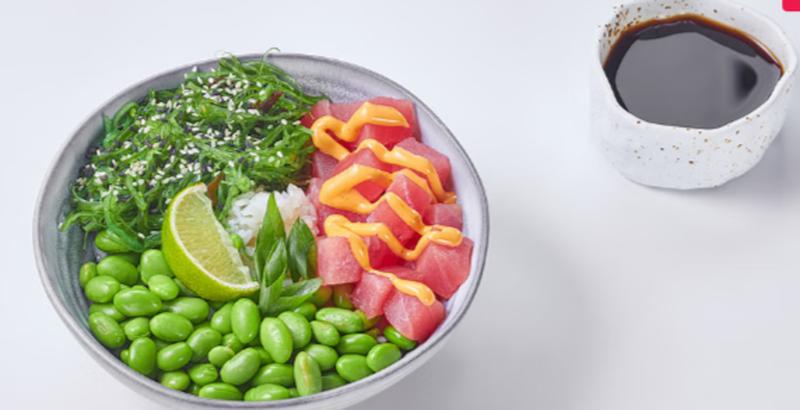 Состав: Тунец, бобы эдамаме, водоросли чука, зеленый лук, кунжут, ореховый соус, спайси соус, поке соус, лайм, рис