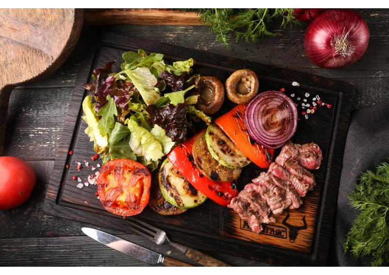 Состав: Овощи гриль (красный лук, баклажан, цукини, болгарский перец), говяжья вырезка, куриное филе и фирменная заправка