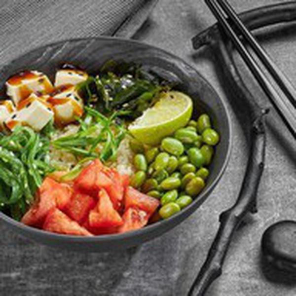 Состав: Тофу, помидор, бобы эдамаме, водоросли чука, водоросли вакамэ, лук зеленый, соус терияки, соус гамадари, лайм, кунжут, рис.