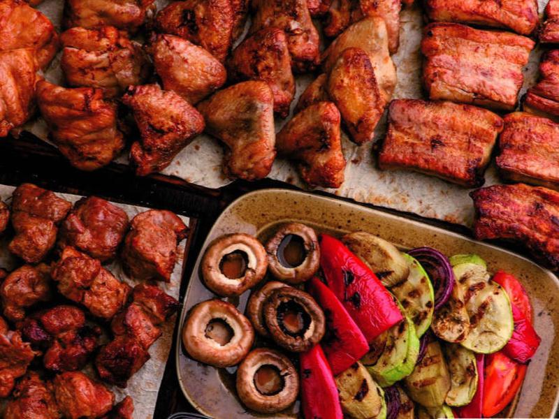 Состав: Шашлык из свиной шеи 800 г, шашлык из куриного бедра 800 г, шашлык из куриных крыльев 800 г, шашлык из свиных ребер 800 г, овощи на гриле 750 г., картофель по-домашнему 600 г, лук маринованный 200 г, соус отар 300 г, лаваш 2 шт, морс 2 л.