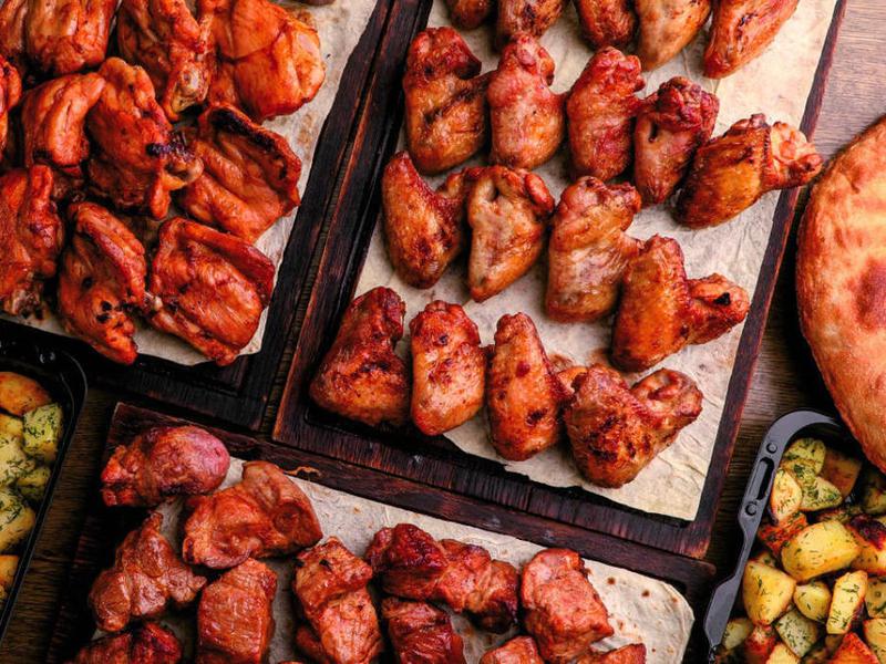 Состав: Шашлык из свиной шеи 1000 г, шашлык из куриного бедра 1000 г, шашлык из куриных крыльев 1000 г, картофель по-домашнему 1000 г, лук маринованный 300 г., соус Отар 400 г., лаваш 2 шт, морс 2 л.