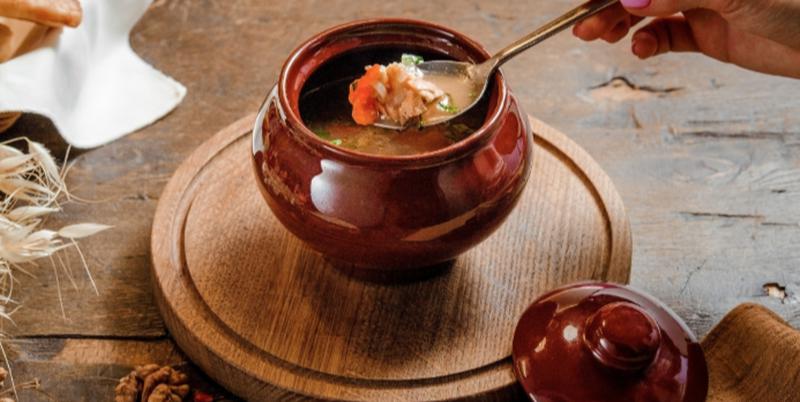 Состав: Настоящий армянский суп! Баклажан, болгарский перец и томат готовим на мангале, добавляем картофель и мякоть говядины. Дополняем зеленью и армянскими специями.