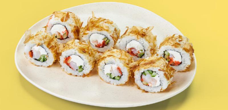 Состав: Креветка, оранжевая икра масаго, сливочный сыр, огурец, стружка тунца, рис (рис, вода, заправка для риса), нори *Не забудьте заказать имбирь, васаби и соевый соус. Они не входят в стоимость заказа.