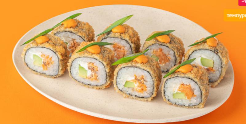 Состав: Сливочный сыр, лосось терияки (лосось, пшеничная мука, подсолнечное масло, терияки соус), авокадо, темпурный кляр (темпурная мука, вода), панировочные сухари, спайси соус, зеленый лук, рис (рис, вода, заправка для риса), нори *Не забудьте заказать имбирь, васаби и соевый соус. Они не входят в стоимость заказа.