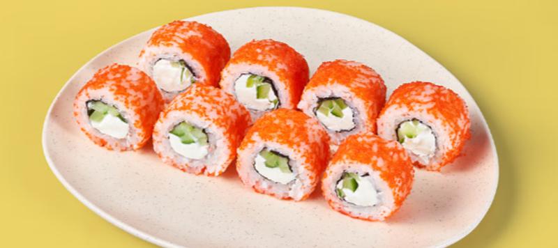 Состав: Сливочный сыр, огурец, оранжевая икра масаго, рис (рис, вода, заправка для риса), нори *Не забудьте заказать имбирь, васаби и соевый соус. Они не входят в стоимость заказа.