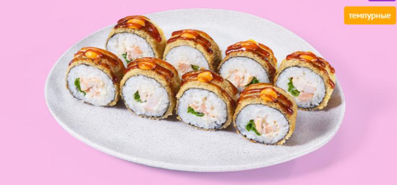 Состав: Курица, зеленый лук, монако с беконом, темпурный кляр, панировочные сухари, унаги соус, спайси соус, рис, нори. *Не забудьте заказать имбирь, васаби и соевый соус. Они не входят в стоимость заказа.