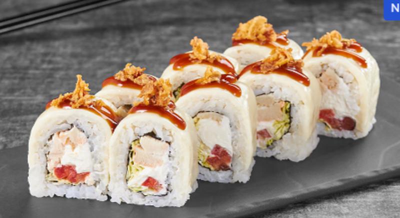 Состав: Сливочный сыр, курица, пекинская капуста, сыр пластик, барбекю соус, лук фри, помидор, рис, нори