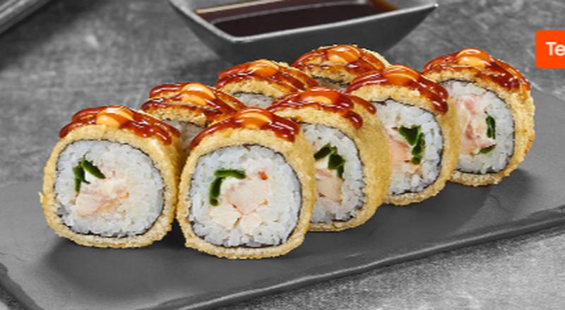Состав: Курица, зеленый лук, монако с беконом, темпурный кляр, панировочные сухари, унаги соус, спайси соус, рис, нори